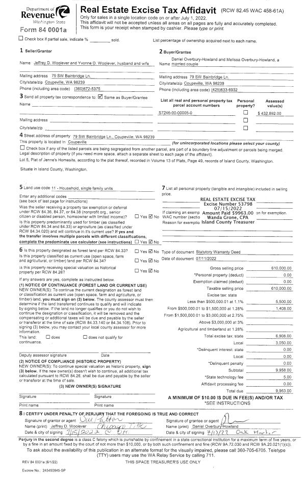 | 2 | 07/11/2022 | WD | Warranty Deed | WOOLEVER, JEFFREY D / YVONNE | OVERBURY-HOWLAND, DANIEL | | | $610,000.00 | 53798 | 4548255 |