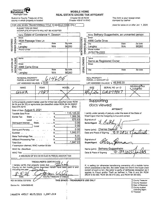| 1 | 08/05/2021 | MANHOME | Manufactured Home | DAWSON, CONSTANCE H | GUGGENHEIM, BETHANY | | | $115,125.00 | 49517 | |