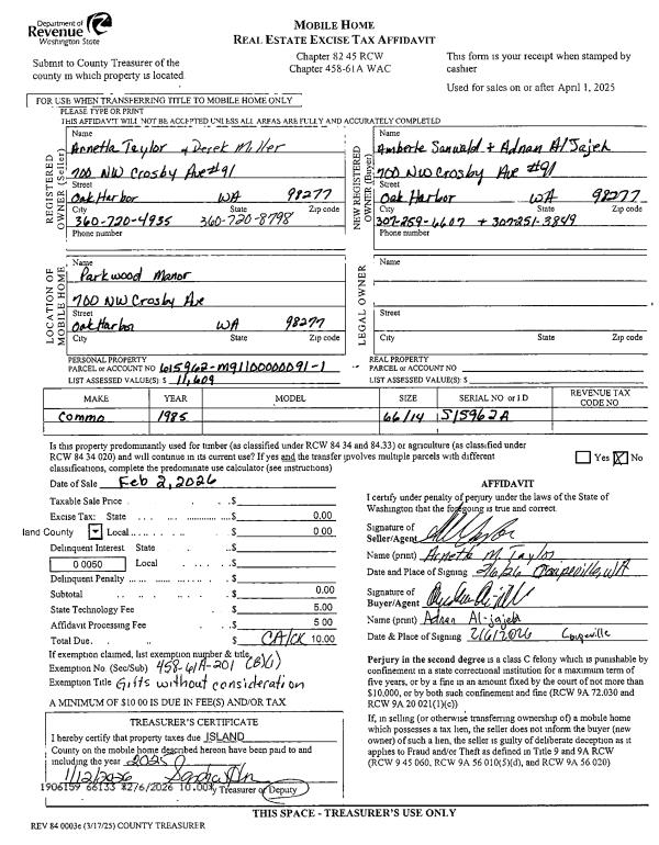 | Mailing Address: | ARNETTA MARION TAYLOR 700 NW CROSBY AVE #91 OAK HARBOR, WA 98277 | % Ownership: | 100.0000000000% |