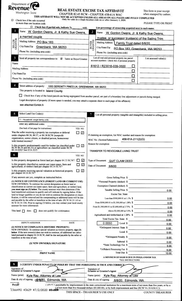 | 1 | 06/08/2020 | QCD | Quit Claim Deed | OWENS, GORDON | OWENS JR TTEE, GORDON W | | | $0.00 | 43629 | 4490393 |