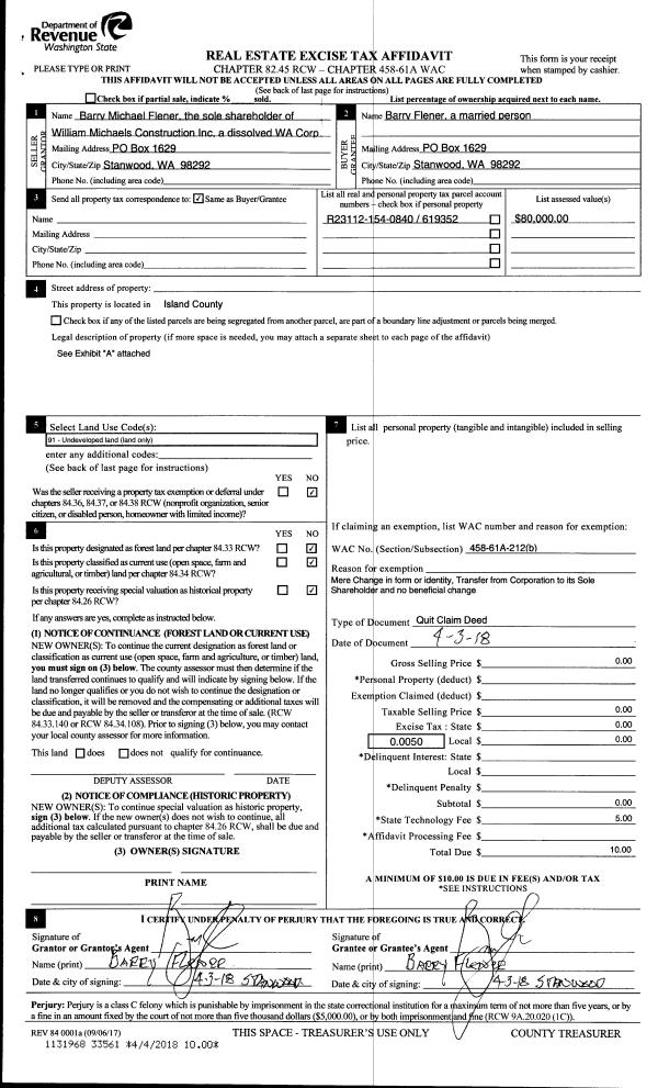 | 2 | 04/03/2018 | QCD | Quit Claim Deed | WILLIAM MICHAELS CONSTRUCTION | FLENER, BARRY | | | $0.00 | 33561 | 4442036 |