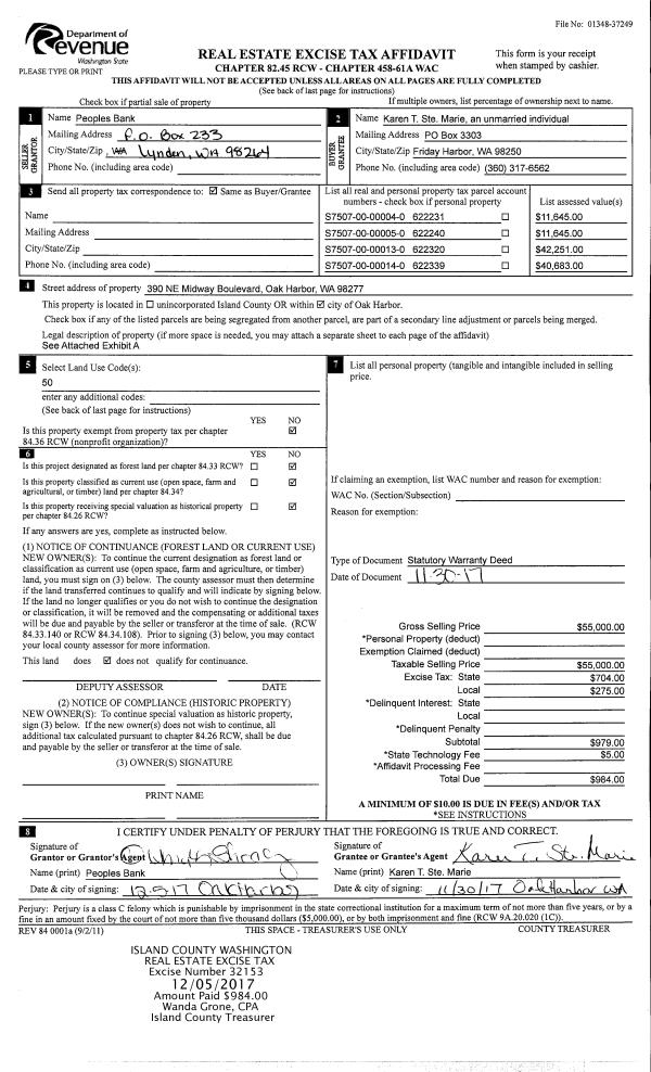 | 3 | 04/19/2013 | DEEDINLIEU | Deed In Lieu Of Foreclosure | SEATREE PROPERTIES LLC | PEOPLES BANK | | | $0.00 | 11091 | 4338352 |