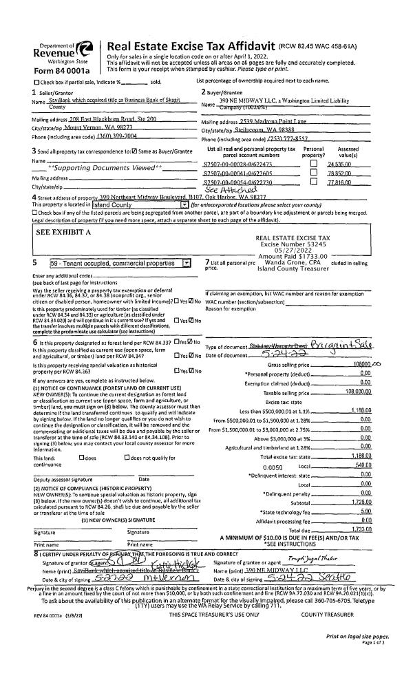 | 2 | 05/24/2022 | WD | Warranty Deed | BUSINESS BANK OF SKAGIT COUNTY | 390 NE MIDWAY LLC | | | $108,000.00 | 53245 | 4545807 |