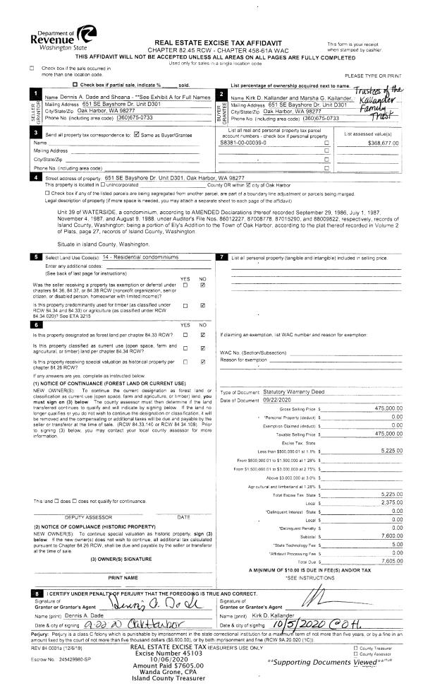 | 1 | 09/22/2020 | WD | Warranty Deed | DADE 1999 LIVING TRUST | KALLANDER TTEE, KIRK D | | | $475,000.00 | 45103 | 4498658 |