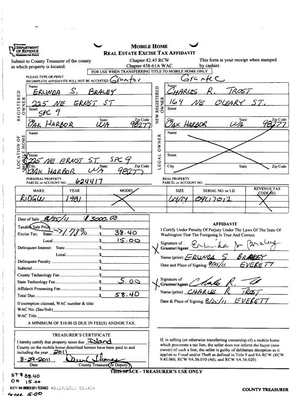 | Mailing Address: | 225 NE ERNST ST #9 OAK HARBOR, WA 98277 | % Ownership: | 100.0000000000% |
