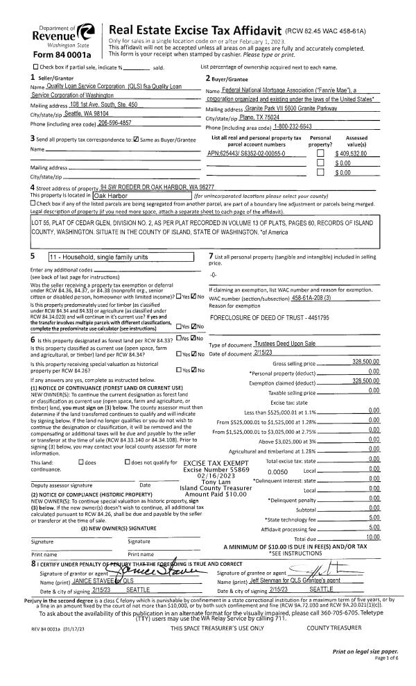 | 2 | 02/15/2023 | TRUSTEED | Trustee's Deed | QUALITY LOAN SERVICE CORPORATION | FANNIE MAE | | | $0.00 | 55869 | 4556782 |