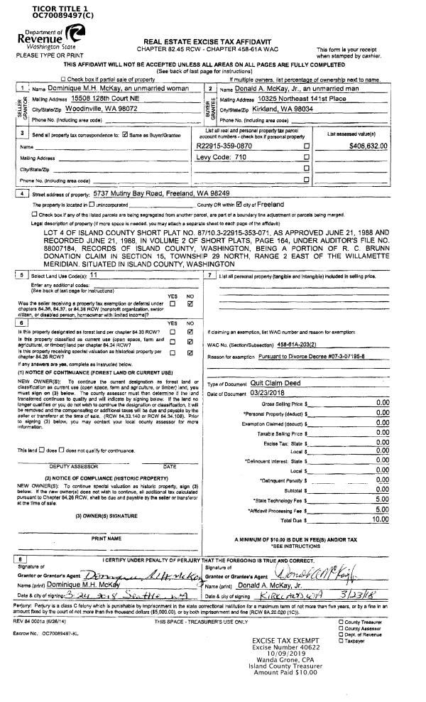 | 1 | 03/23/2018 | QCD | Quit Claim Deed | MCKAY JR, DONALD A | MCKAY JR, DONALD A | | | $0.00 | 40622 | 4473071 |