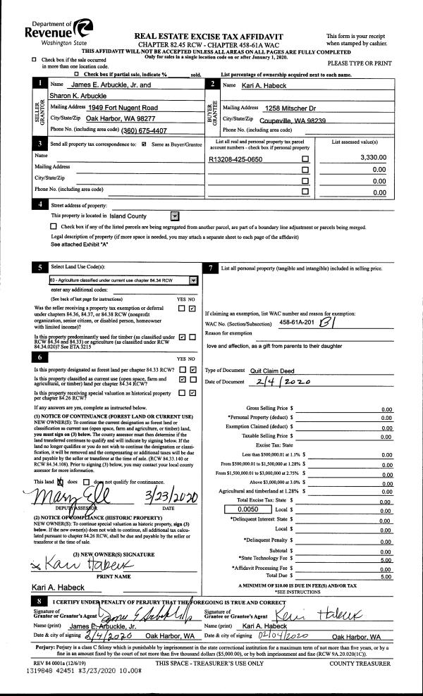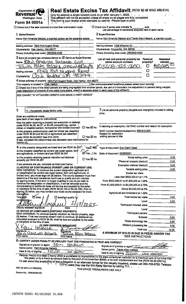 | Mailing Address: | TRAVIS ALLEN HABECK 1943 FORT NUGENT RD OAK HARBOR, WA 98277-8885 | % Ownership: | 100.0000000000% |