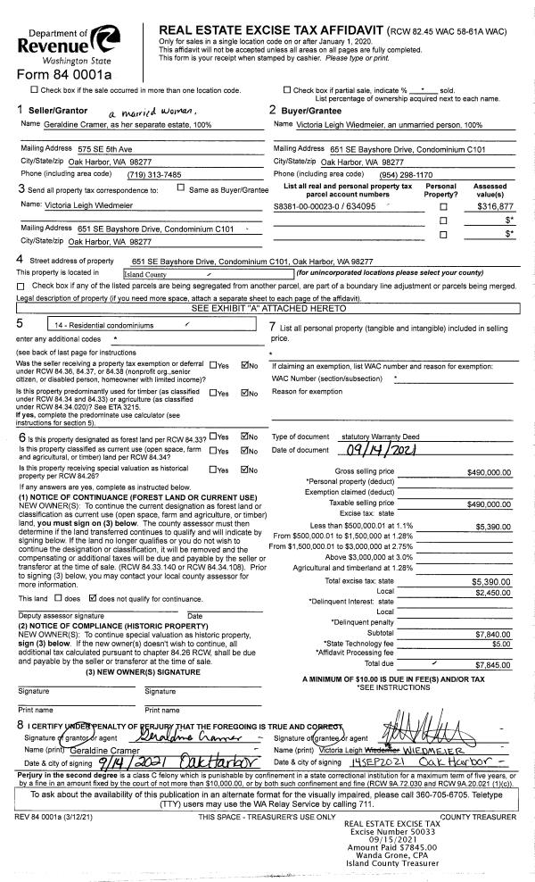 | 1 | 09/14/2021 | WD | Warranty Deed | CRAMER, GERALDINE | WIEDMEIER, VICTORIA LEIGH | | | $490,000.00 | 50033 | 4529133 |
