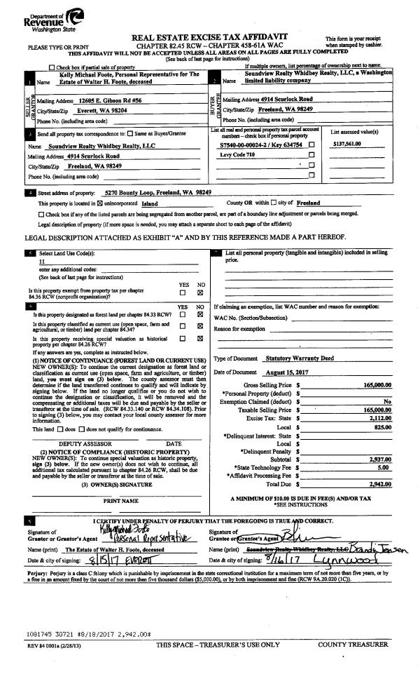 | 2 | 08/15/2017 | WD | Warranty Deed | FOOTE, WALTER H | SOUNDVIEW REALTY WHIDBEY REALTY, LLC | | | $165,000.00 | 30721 | 4428501 |