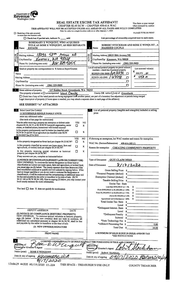 | 3 | 08/17/2020 | QCD | Quit Claim Deed | WINQUIST, ROSE E | STOCKHAM, ROBERT | | | $0.00 | 44305 | 4494247 |