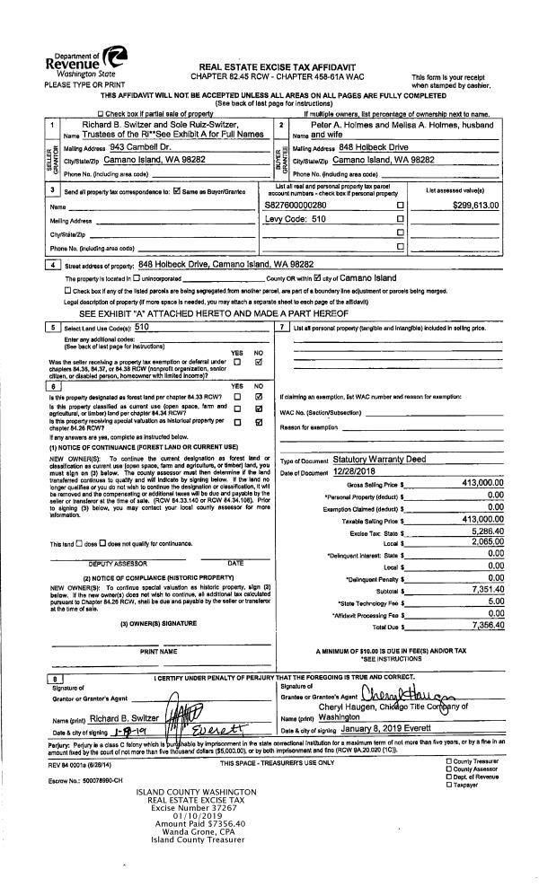 | Mailing Address: | MELISA A HOLMES 848 HOLBECK DR CAMANO ISLAND, WA 98282 | % Ownership: | 100.0000000000% |