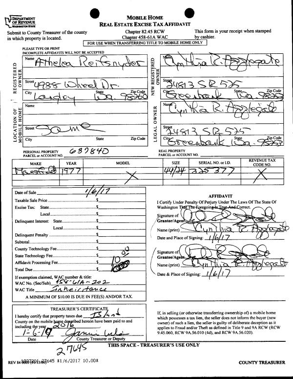 | 3 | 01/06/2017 | MANHOME | Manufactured Home | REIFSNYDER, ATHELEA K | APPLEGATE, CYNTHIA R | | | $0.00 | 27645 | |
