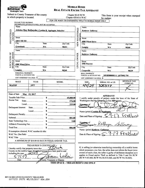 | 2 | 05/15/2017 | MANHOME | Manufactured Home | APPLEGATE, CYNTHIA R | GALLOWAY, KATHRYN | | | $45,000.00 | 29271 | |