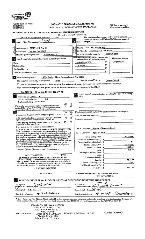 | Mailing Address: | MELISSA M WILSON 603 FORREST WAY CAMANO ISLAND, WA 98282 | % Ownership: | 100.0000000000% |