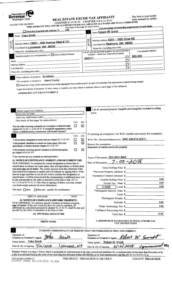| 1 | 07/05/2018 | QCD | Quit Claim Deed | SMIDT, YOKO | SMIDT, ROBERT W | | | $0.00 | 36642 | 4454993 |
