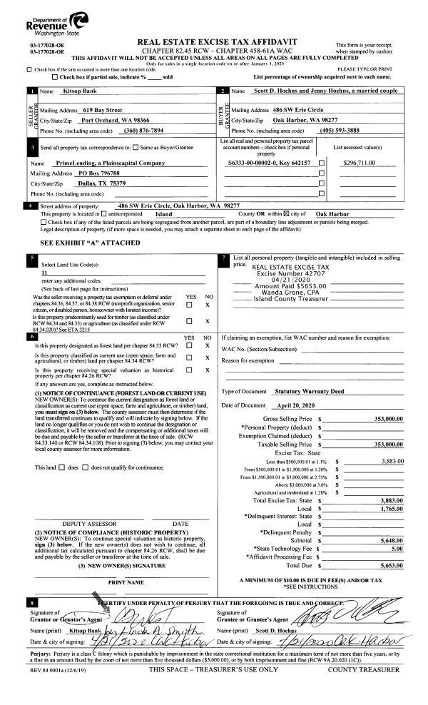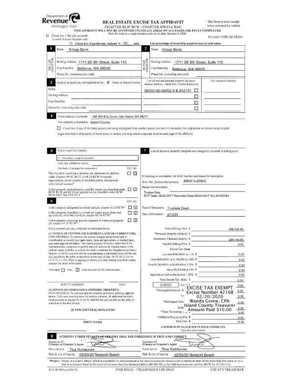 | 2 | 04/20/2020 | WD | Warranty Deed | KITSAP BANK | HOEHNS, SCOTT D | | | $353,000.00 | 42707 | 4485190 |