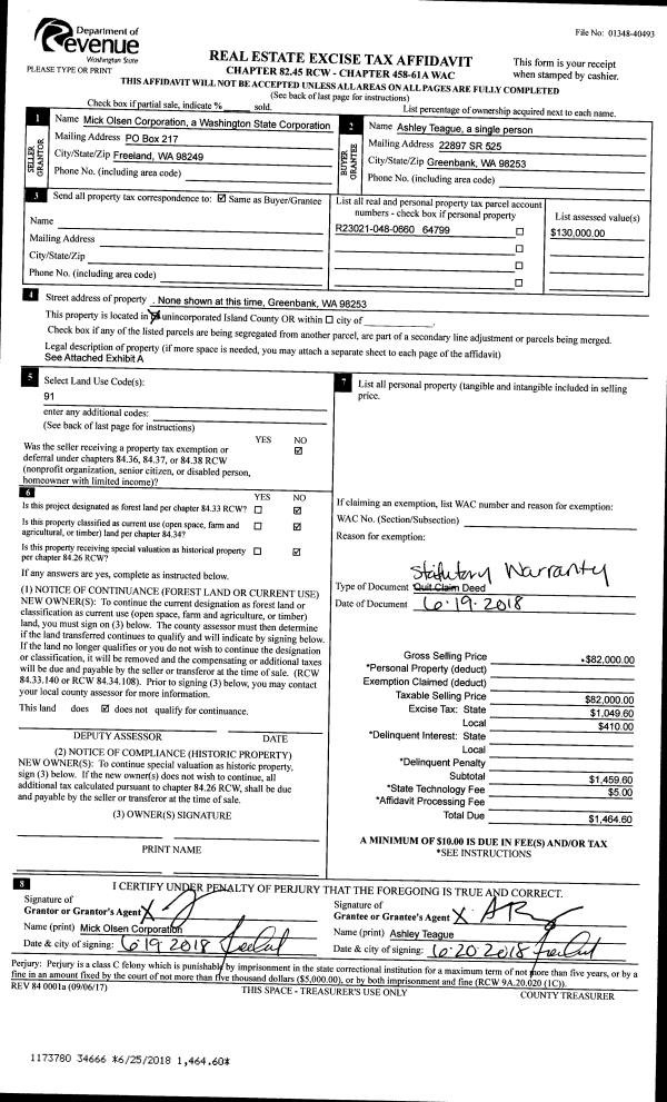 | 1 | 06/20/2018 | QCD | Quit Claim Deed | TEAGUE, ASHLEY | THE MICK OLSEN CORPORATION | | | $0.00 | 34665 | 4446759 |