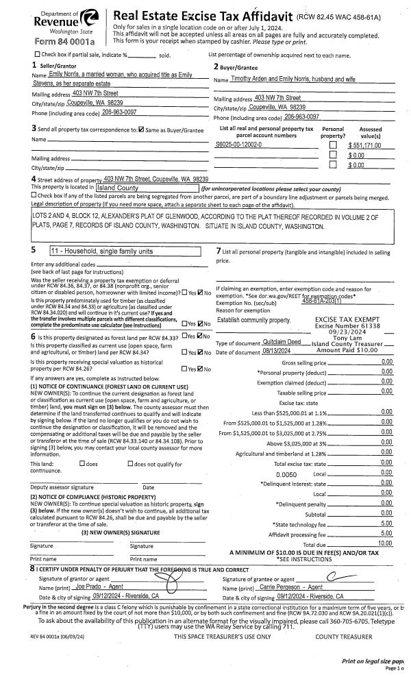 | Mailing Address: | EMILY NORRIS 403 NW 7TH ST COUPEVILLE, WA 98239 | % Ownership: | 100.0000000000% |