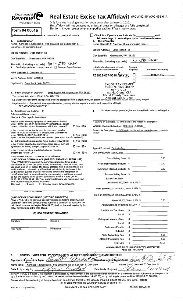 | 2 | 05/04/2021 | QCD | Quit Claim Deed | DRECHSEL, KENNETH T | DRECHSEL III, KENNETH T | | | $0.00 | 48162 | 4518693 |