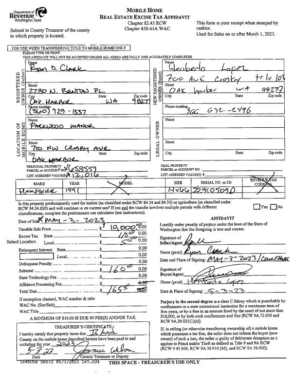 | 2 | 05/02/2023 | MANHOME | Manufactured Home | CLARK, RYAN D | LOPEZ, HERIBERTO | | | $10,000.00 | 56572 | |