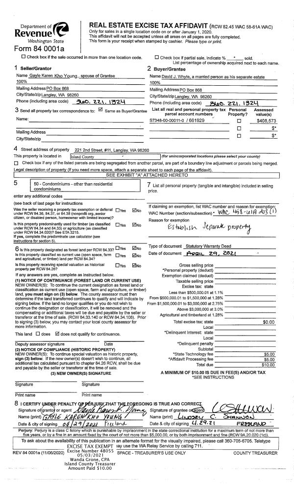 | 1 | 04/29/2021 | QCD | Quit Claim Deed | KHO YOUNG, GAYLE KAREN | WHYTE, DAVID J | | | $0.00 | 48055 | 4518016 |
