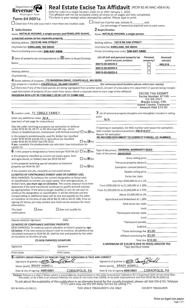 | 3 | 10/25/2019 | WD | Warranty Deed | HIGGINS, NATALIE | HIGGINS, NATALIE | | | $0.00 | 47199 | 4512602 |