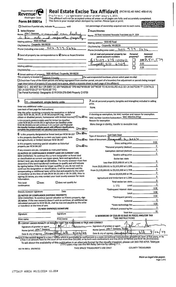 | 1 | 08/02/2024 | QCD | Quit Claim Deed | SESSIONS, JOHN T | HILL ROAD HOMESTEAD REVOCABLE TRUST | | | $0.00 | 60826 | 4575384 |