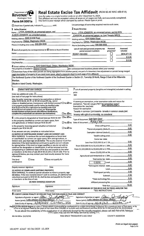 | 1 | 02/18/2025 | QCD | Quit Claim Deed | JOHNSON, LYDIA | JOHNSON JTWROS, LYDIA | | | $0.00 | 62667 | 4582678 |