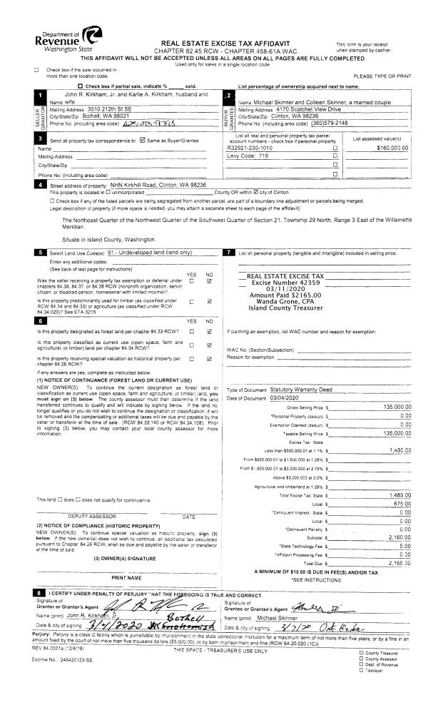 | Mailing Address: | COLLEEN SKINNER 4170 SCATCHET VIEW DR CLINTON, WA 98236 | % Ownership: | 100.0000000000% |