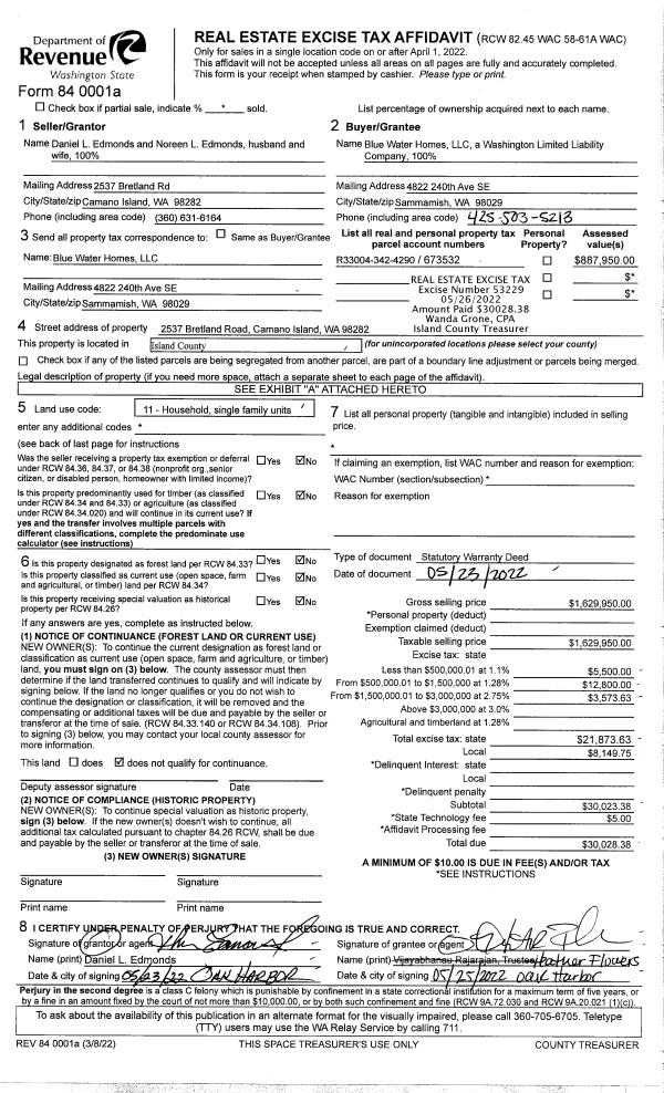 | 1 | 05/23/2022 | WD | Warranty Deed | EDMONDS, DANIEL L | BLUE WATER HOMES, LLC | | | $1,629,950.00 | 53229 | 4545711 |