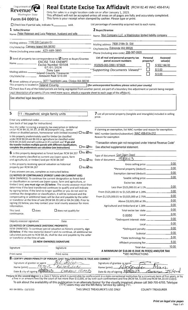 | 1 | 11/03/2023 | QCD | Quit Claim Deed | REIERSON, PETER | MUN COMPANY LLC | | | $0.00 | 60508 | 4574080 |