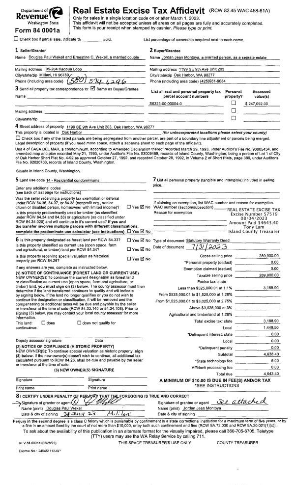 | 2 | 07/31/2023 | WD | Warranty Deed | WEKELL, DOUGLAS PAUL | MONTOYA, JORDAN JEAN | | | $289,900.00 | 57519 | 4563067 |