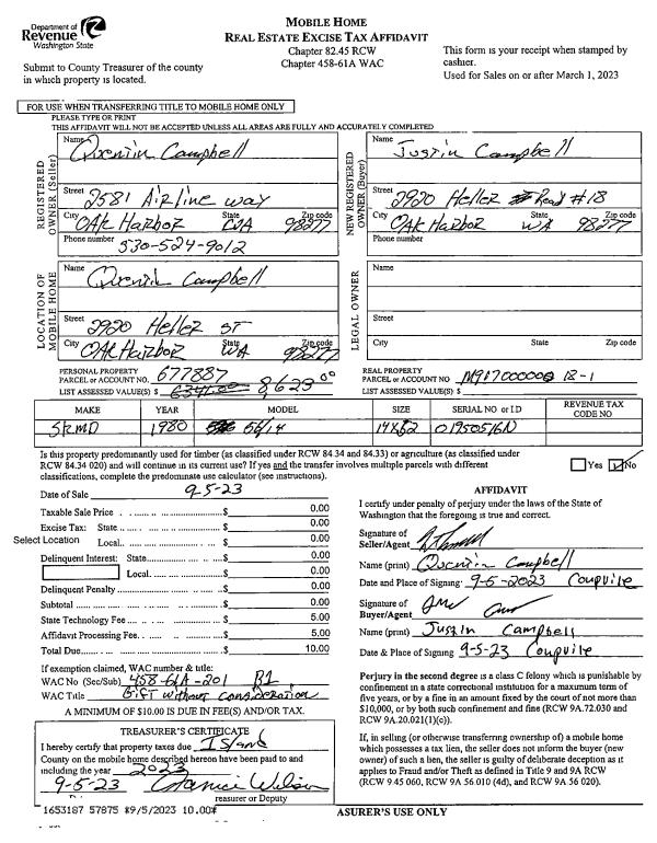 | 1 | 09/05/2023 | MANHOME | Manufactured Home | CAMPBELL, QUENTIN | CAMPBELL, JUSTIN | | | $0.00 | 57875 | |