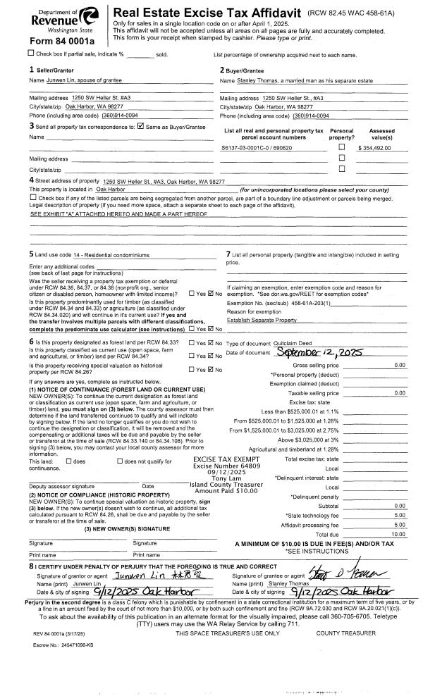 | 1 | 09/12/2025 | QCD | Quit Claim Deed | LIN, JUNWEN | THOMAS, STANLEY | | | $0.00 | 64809 | 4590882 |