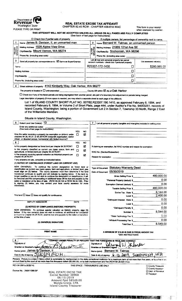 | 1 | 06/24/2024 | WD | Warranty Deed | TALMAS, BERNARD W | SUNSHINEM OAK HARBOR LLC | | | $612,500.00 | 60530 | 4574134 |
