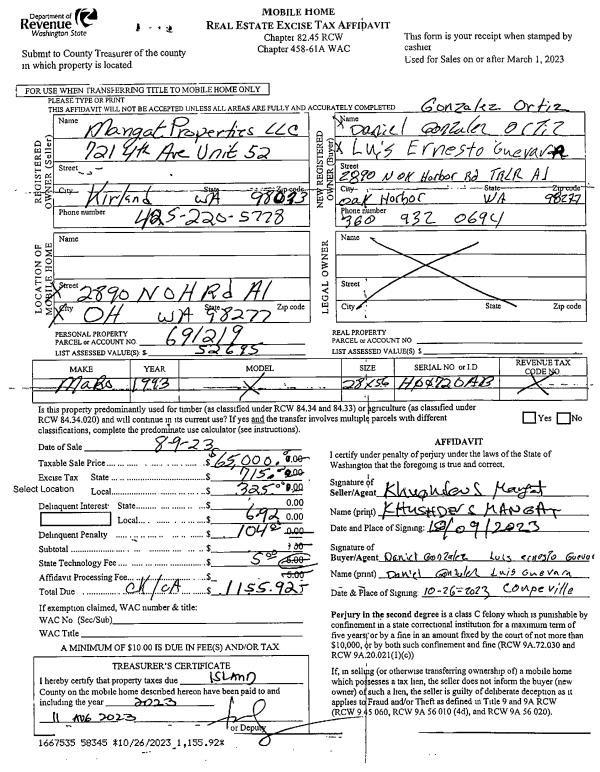 | 1 | 08/09/2023 | MANHOME | Manufactured Home | MANGAT PROPERTIES, LLC | ORTIZ, DANIEL GONZALEZ | | | $65,000.00 | 58345 | |