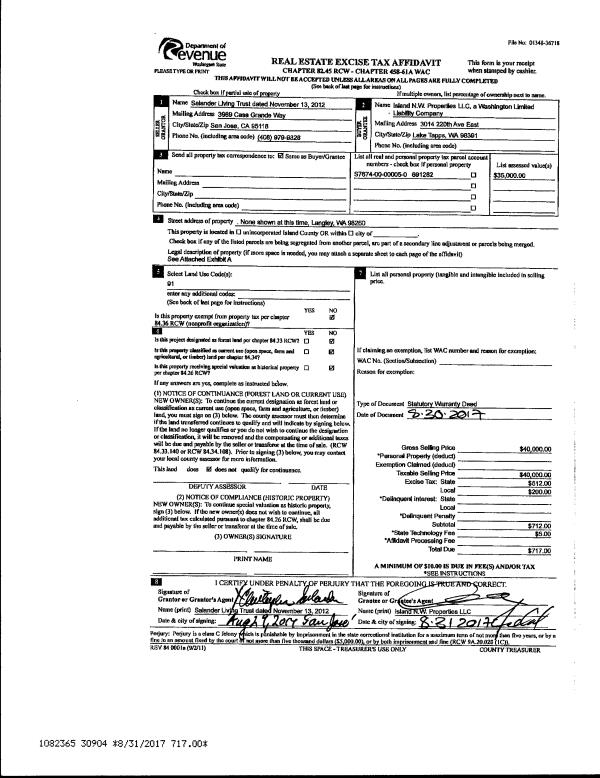 | 2 | 08/30/2017 | WD | Warranty Deed | SALANDER CO TRUSTEE, CHRISTOPHER | ISLAND N W PROPERTIES, LLC | | | $40,000.00 | 30904 | 4429310 |