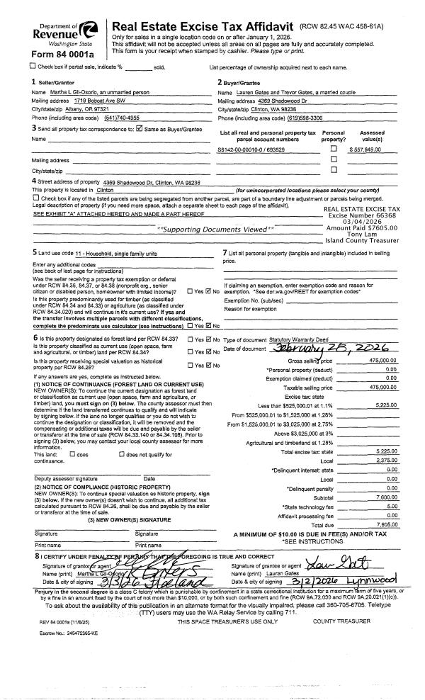| Mailing Address: | MARTHA L GIL-OSORIO 4369 SHADOWOOD DR CLINTON, WA 98236-9541 | % Ownership: | 100.0000000000% |