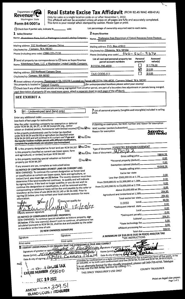 | 3 | 12/20/2022 | EZ | Easement | KRISTOFERSON FARM, LLC | WASHINGTON STATE DEPARTMENT OF NATURAL RESOURCES | | | $19,916.00 | 55500 | 4555231 |