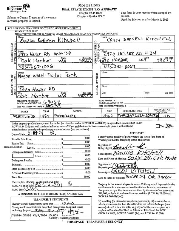 | 2 | 05/09/2024 | MANHOME | Manufactured Home | KITCHELL, BAILLIE | KITCHELL, CRISSY DARNELL | | | $0.00 | 59886 | |