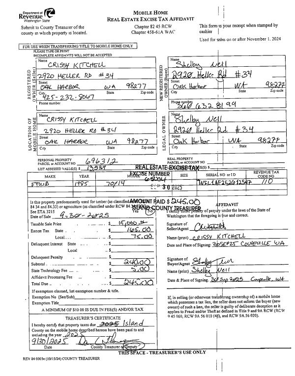| Mailing Address: | 2920 HELLER RD #34 OAK HARBOR, WA 98277 | % Ownership: | 100.0000000000% |