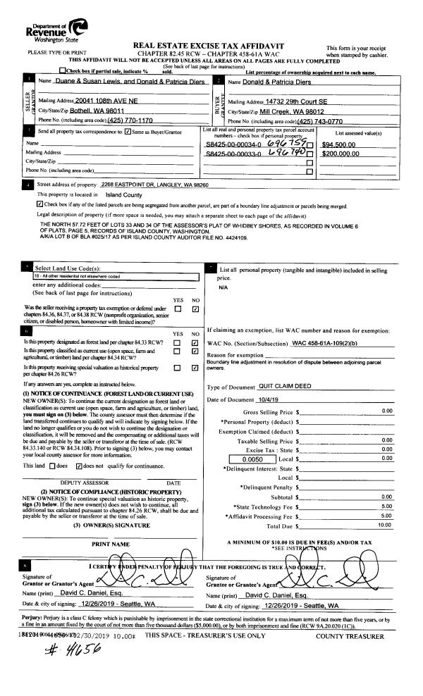 | 1 | 10/04/2019 | QCD | Quit Claim Deed | DIERS, DONALD G | DIERS, DONALD | | | $0.00 | 41656 | 4478419 |