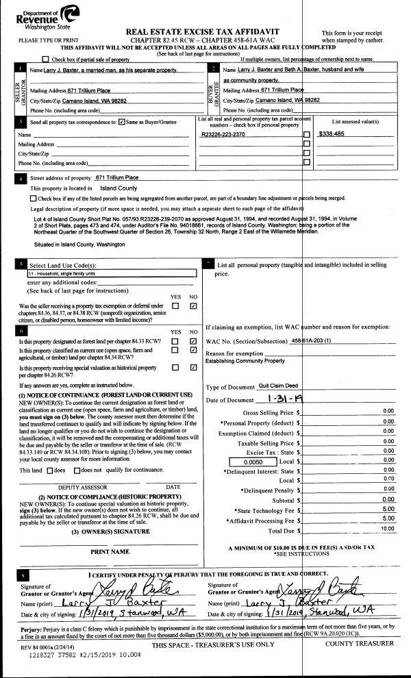 | 2 | 01/31/2019 | QCD | Quit Claim Deed | BAXTER, LARRY J | BAXTER, LARRY J | | | $0.00 | 37582 | 4459240 |