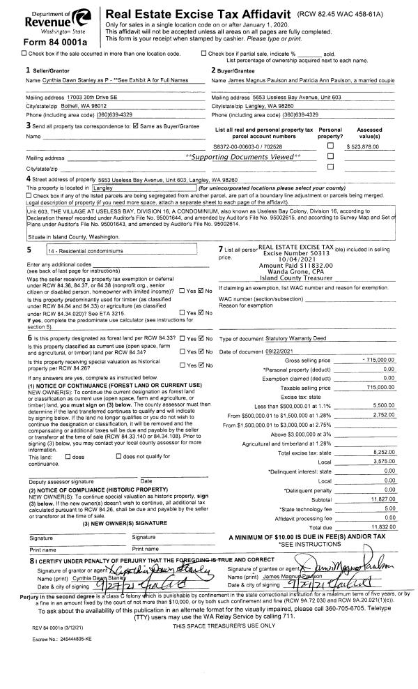 | Mailing Address: | PATRICIA ANN PAULSON 5653 USELESS BAY AVE UNIT 603 LANGLEY, WA 98260 | % Ownership: | 100.0000000000% |