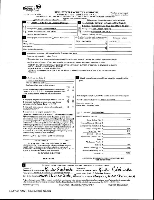 | 2 | 03/29/2021 | TRUSTEED | Trustee's Deed | SCHRICKER TTEE, KRISTIN E | SCHRICKER, KRISTIN E | | | $0.00 | 47584 | 4515190 |