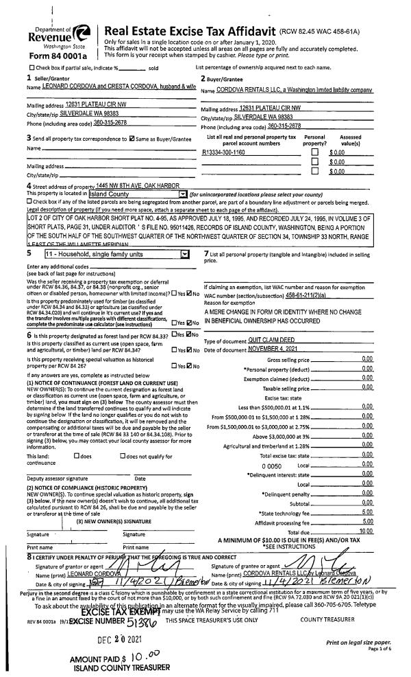 | 2 | 11/04/2021 | QCD | Quit Claim Deed | CORDOVA, LEONARD | CORDOVA RENTALS, LLC | | | $0.00 | 51386 | 4536229 |