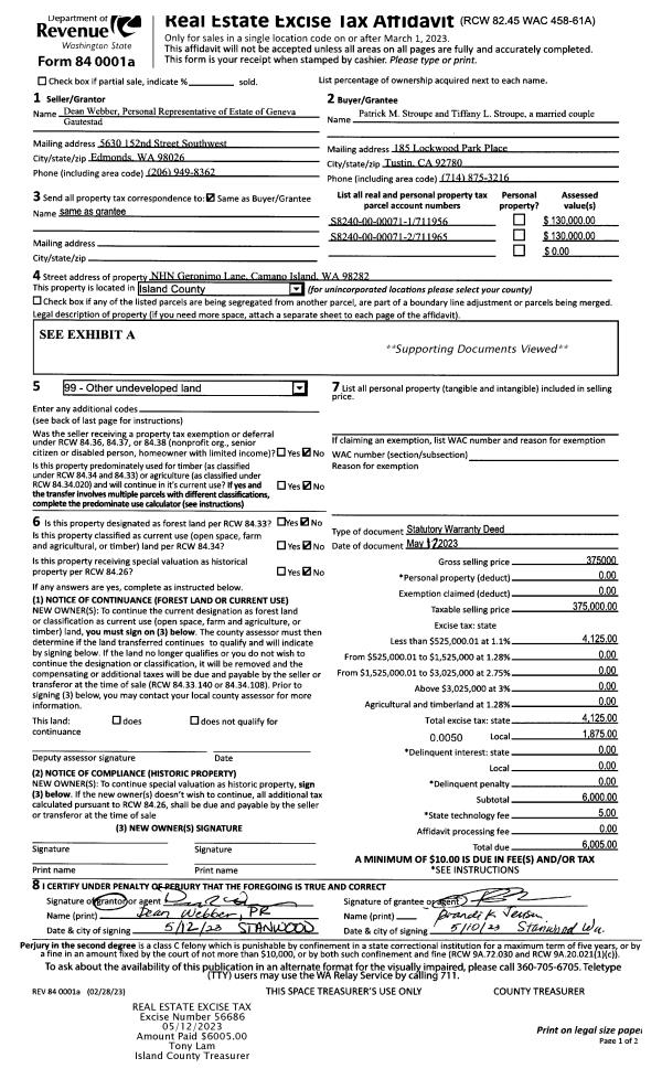 | 1 | 05/12/2023 | WD | Warranty Deed | GAUTESTAD, GENEVA | STROUPE, PATRICK M | | | $375,000.00 | 56686 | 4559862 |