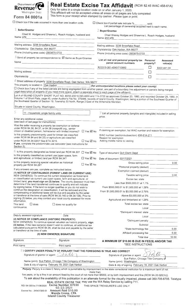 | Mailing Address: | SHAWNA L ROACH HODGES 3236 SNOWFLAKE RD OAK HARBOR, WA 98277 | % Ownership: | 100.0000000000% |