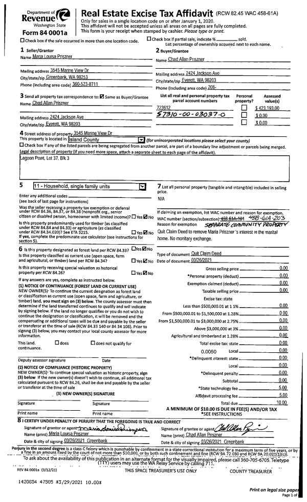 | 1 | 03/26/2021 | QCD | Quit Claim Deed | PRISZNER, CHAD A | PRISZNER, CHAD ALLAN | | | $0.00 | 47505 | 4514763 |